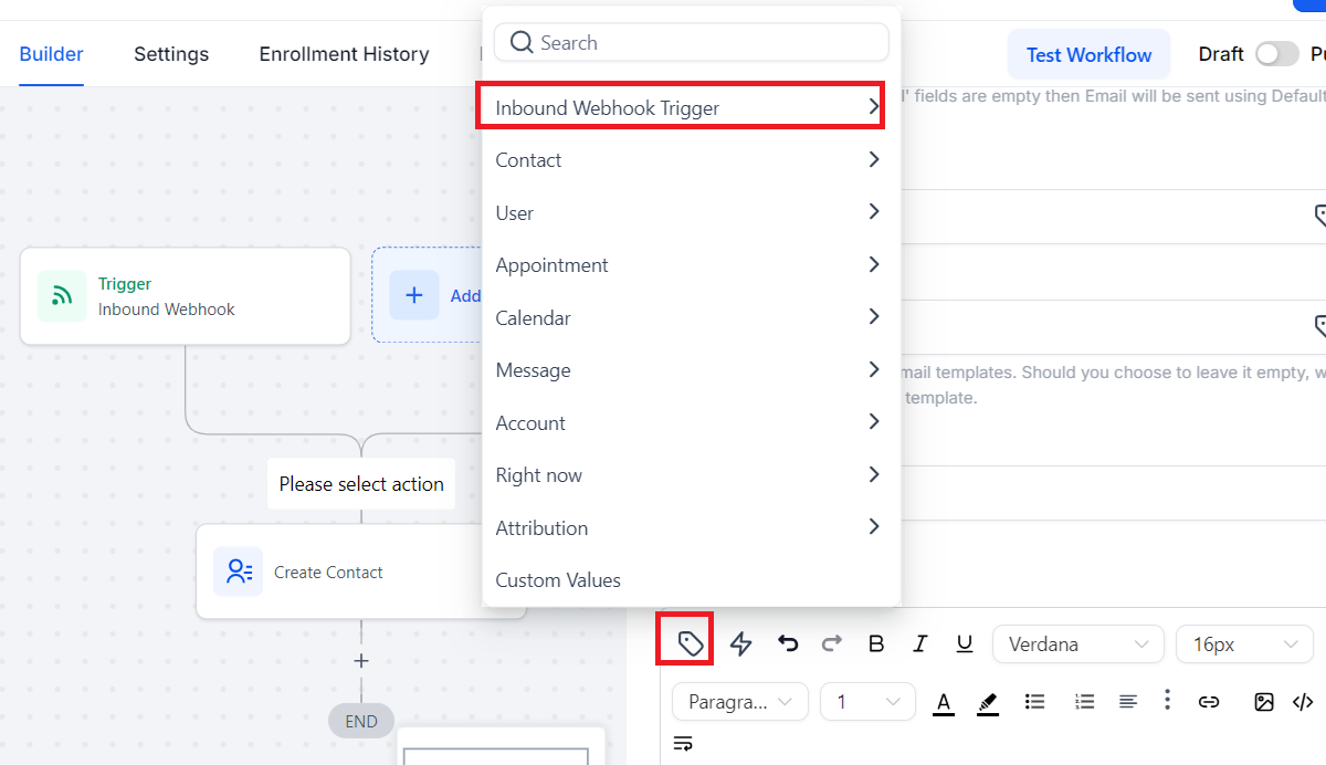 - In “Message” section, click “Custom Values” Button showing below, a window is popped up, choose “Inbound Webhook Trigger”