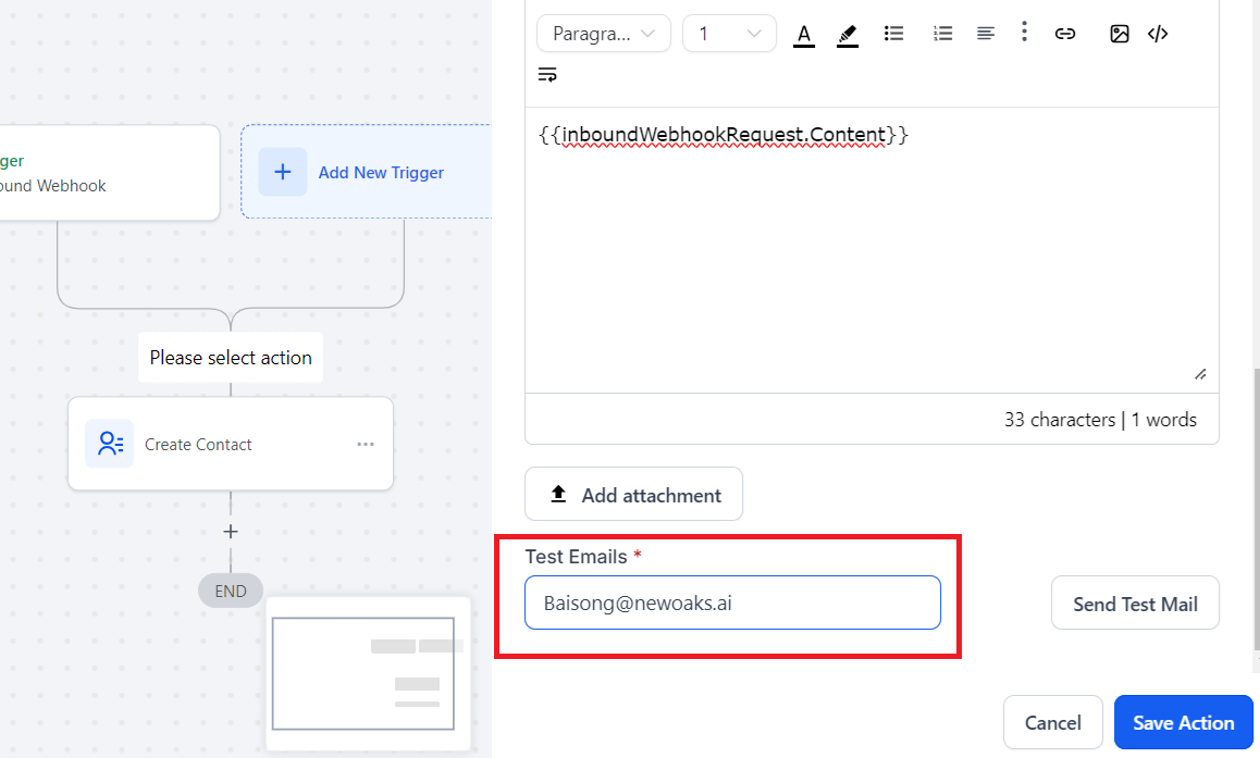 Click "Add field" button, choose Fields "Email", and click the little icon, in the popupwindow, choose {{inboundWebhookRequest.Email}}